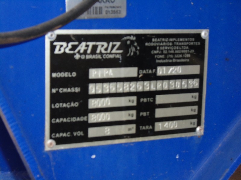 PIPA, CAPACIDADE 8.OOO LITROS, VOLUME 8M3, ANO 2020, TARA 1.400KG LOTE ÚNICO - SERÁ VENDIDO NO ESTADO EM QUE SE ENCONTRA - RETIRADA/CARREGAMENTO POR CONTA DO COMPRADOR - VERIFIQUE CONDIÇÕES DE RETIRADA - NÃO SERÁ ACEITA RECLAMAÇÕES POSTERIORES -Despesas, ausência de teste, peças, processos junto ao Detran (remarcação/regularização/chassi/motor e carroceria) sendo de responsabilidade do comprador. VISITAÇÃO “Conforme orientações e para que possamos ficar em linha com as ações de prevenção da proliferação do vírus Covid-19, agende a visita e fique atento aos procedimentos, evitando assim, aglomerações. Havendo alterações nos procedimentos, serão mencionadas aqui na descrição do lote.”