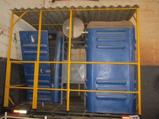 LOTE 08 - CARRETA REBOQUE 4 PNEUS COM 2 BANHEIROS QUÍMICOS MÓVEIS MASCULINO E FEMININO; C/ ÁRMARIO DE FERRO E CAIXA D'ÁGUA INÓX