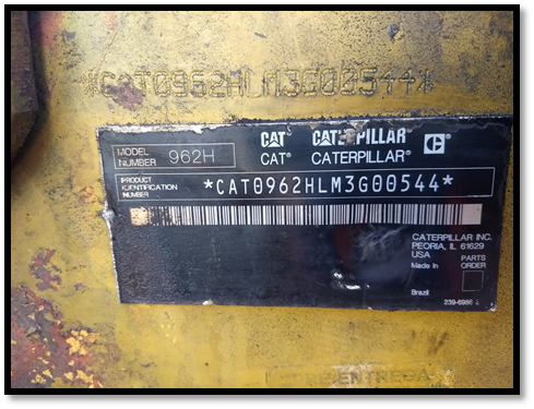082-1200-2017 - PÁ CARREGADEIRA - CATERPILLAR - 962H - ANO: 2009 - SERIAL / CHASSI: HLM3G0054 / CAT0962HLM3G00544 - RENAVAM: N/A - PLACA: N/A - TAG/CP: PCH10/PCP45 - KMS / HRS TRABALHADAS: 14.620 - CONDIÇÃO: DESATIVADO - IMOBILIZADO: 1000579522 - 8000007659 - MOTOR: SIM - TRANSMISSÃO: SIM - CAÇAMBA(PÁ)/LÂMINA: NÃO - CARREGAMENTO E TRANSPORTE SOB RESPONSABILIDADE DO CLIENTE, NECESSÁRIO GUINDASTE E CARRETA PRANCHA; MOTOR NÃO FUNCIONA; EQUIPAMENTO NÃO POSSUI RADIADOR; EQUIPAMENTO NECESSITA DE MANUTENÇÃO MECÂNICA, ELÉTRICA E ESTRUTURAL,EQUIPAMENTO SEM CONCHA. - SERÁ VENDIDO NO ESTADO DE CONSERVAÇÃO EM QUE SE ENCONTRA. - ESTE EQUIPAMENTO, DEVIDO SUAS DIMENSÕES, EXIGIRÁ DESMONTAGEM PARCIAL/TOTAL PARA PROPORCIONAR O SEU TRANSPORTE/RETIRADA. PARA TRABALHOS EM ALTURA SUPERIOR A 1,80 MTS FAZ-SE NECESSÁRIO A UTILIZAÇÃO DE ESCADA PLATAFORMA E/OU PLATAFORMA ELEVATÓRIA. PARA IÇAMENTO DAS CARGAS, DEVERÁ SER UTILIZADO EQUIPAMENTO DE GUINDAR COM CAPACIDADE COMPATÍVEL COM O PESO DA PEÇA. PARA PEÇAS COM PESO SUPERIOR A 10 T SERÁ NECESSÁRIO PLANO DE RIGG. PARA MOVIMENTAÇÃO DE PEÇAS DEVERÁ SER UTILIZADO CAMINHÃO MUNCK OU EMPILHADEIRA COM CAPACIDADE COMPATÍVEL COM O PESO DESTES ITENS. DEVERÁ SER OBSERVADO O CUMPRIMENTO A LEGISLAÇÃO APLICÁVEL E ATENDIMENTO AOS REQUISITOS LEGAIS. LOC: VITÓRIA / ES