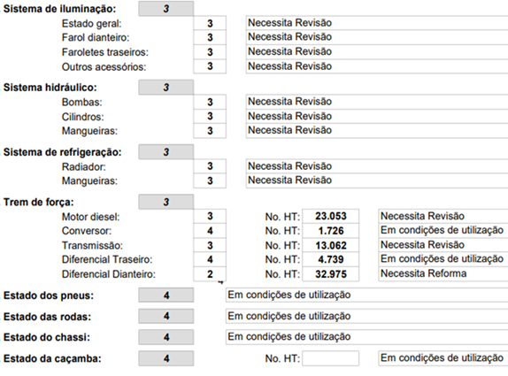 Equipamento será vendido nas condições em que se encontra: Segue detalhamento da avaliação da área. - LOTE ÚNICO - SERÁ VENDIDO NO ESTADO EM QUE SE ENCONTRA - MECÂNICA SEM TESTE - PODE HAVER FALTA DE PEÇAS, REMARCAÇÕES/REGULARIZAÇÕES/ OUTROS, CHASSIS/MOTOR,CARROCERIA/OUTROS, SERÁ POR CONTA DO COMPRADOR - RETIRADA/CARREGAMENTO POR CONTA DO COMPRADOR - VERIFIQUE CONDIÇÕES DE RETIRADA - NÃO SERÃO ACEITAS RECLAMAÇÕES POSTERIORES.