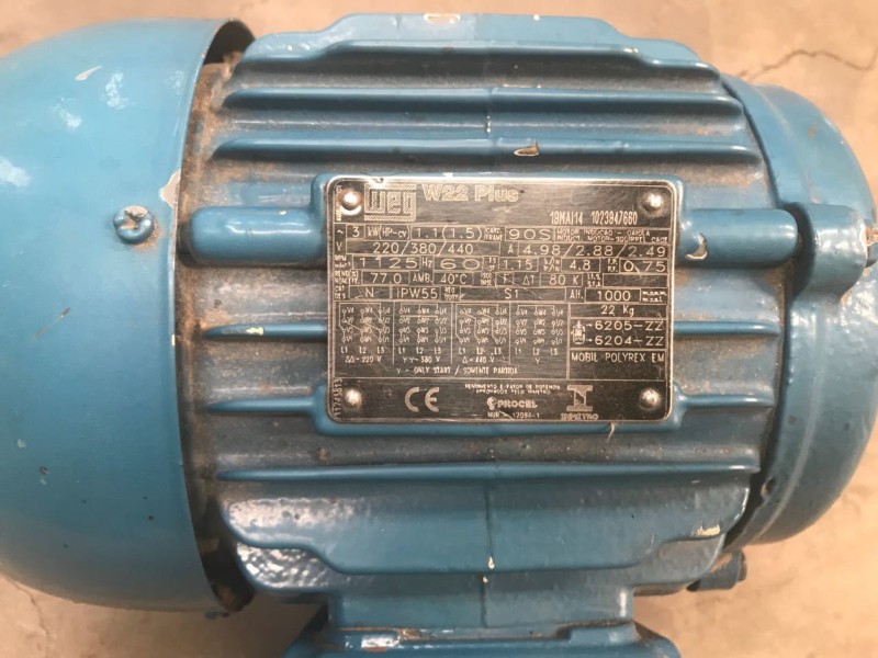 MOTOR ELÉTRICO DA BOMBA DE COMBUSTÍVEL, MARCA WEG, ANO 2014, 1,5CV, TRIFÁSICO 220/380/440, 1125 RPM, PARA USINA DE ASFALTO MARCA CIBER. EQUIPAMENTO USADO E NO ESTADO DE CONSERVAÇÃO E FUNCIONAMENTO EM QUE SE ENCONTRA. LOCAL - BARUERI - SP
