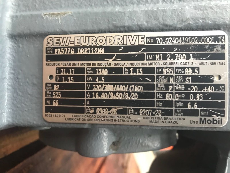 MOTOR REDUTOR DA CORREIA TRANSPORTADORA, SEW-EURODRIVE, ANO 2014, 5,5CV, 1740 RPM, 220/380/440 TRIFÁSICO. EQUIPAMENTO USADO E NO ESTADO DE CONSERVAÇÃO E FUNCIONAMENTO EM QUE SE ENCONTRA. LOCAL - BARUERI - SP
