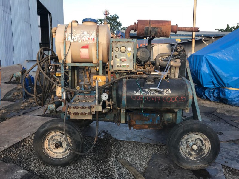 MOTO-BOMBA ALTA PRESSÃO HIDROJATO, MARCA LEMASA, MODELO L.120.3 SAP III P.28, ANO 2009. COMPOSTO POR: - POTÊNCIA MÁXIMA: 90 KW - TIPO DE ÓLEO: ISO-220 - RPM I: 3,6:1 - KIT DE PISTÃO: P-28 - P. MÁX BAR: 700 - VERSÃO MÁXIMA DE TRABALHO: 74I/MIN - POTÊNCIA: 125CV - ROTAÇÃO: 180 RPM - PESO DA BOMBA (SEM MOTOR E BASE): 400 KG EQUIPAMENTO USADO ENCONTRA-SE EM ÓTIMO ESTADO DE CONSERVAÇÃO E FUNCIONAMENTO. LOCAL - BARUERI - SP
