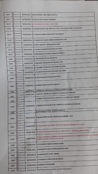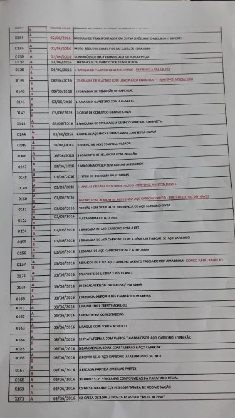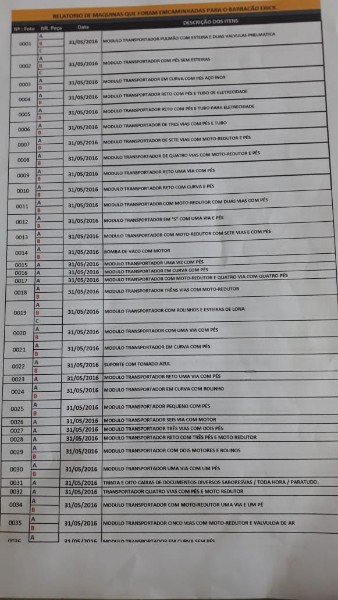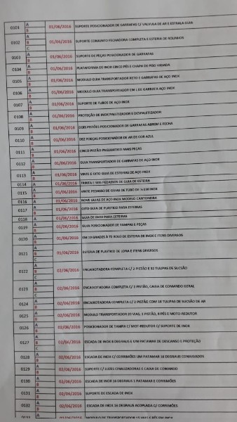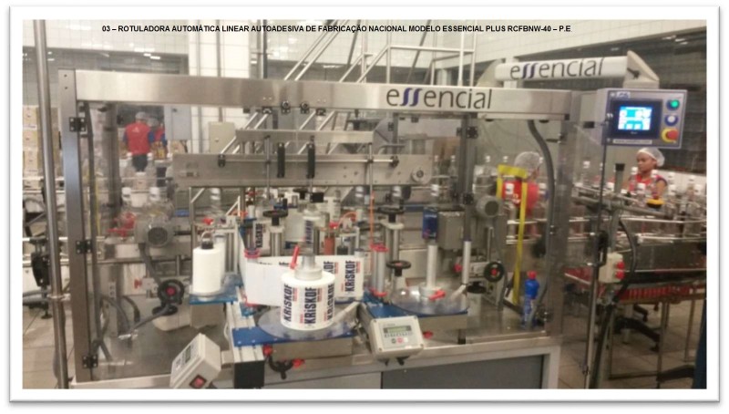 VEJA DESCRITIVO DE ITENS - PESO TOTAL APROXIMADO DOS ITENS ENTRE 70 E 80 toneladas - 1 CALDEIRA PARA 1 tonelada de pressão - 1 - ENVASADORA ZEGLA BLOCADA RZ-RT 24-30-6 GR - 02 – ROTULADORA EXTRA FIX – KOSME - 03 – ROTULADORA AUTOMÁTICA LINEAR AUTOADESIVA DE FABRICAÇÃO NACIONAL MODELO ESSENCIAL PLUS RCFBNW-40 – P.E. - 04 – ENCAIXOTADORA PLUG END PLEY – ZEGLA. - 2 ENCAIXOTA DORA PLUG END PLEY – ZEGLA - 06 – FECHADORA DE CAIXA HOT MELT – TECNOR MODELO TEC-SIX - 07 – ESTEIRAS TRANSPORTADORAS DE VAZILHAMES – GARRAFAS DE VIDRO - ITENS JÁ DESMONTADOS O CARREGAMENTO SEM CUSTO SERÁ POR CONTA DO VENDEDOR DESDE QUE O COMPARADOR COMPAREÇA COM O TRANSPORTE ADEQUADO - LOTE ÚNICO SERÁ VENDIDO NO ESTADO - VISITE O LOTE NÃO SERÁ ACEITA RECLAMAÇÕES POSTERIORES - AGUARDE MAIS INFORMAÇÕES
