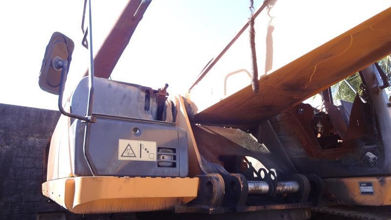 Equipamento pegou fogo, cabine destruida, sem motor, sem bomba hidráulica principal, material rodante incompleto e desmontado, conjunto de escavo sem sinais de trincas ou soldas , somente com pistão da caçamba e sem a caçamba completa. Possui motor de giro e grupo de válvulas.
