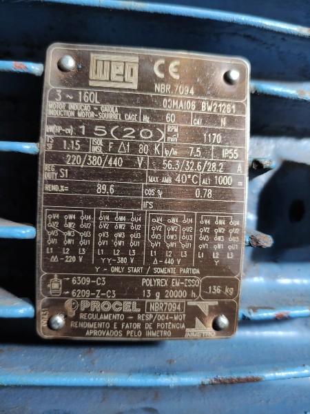 MOTOR ELÉTRICO TRIFÁSICO WEG 20 CV 6 POLOS