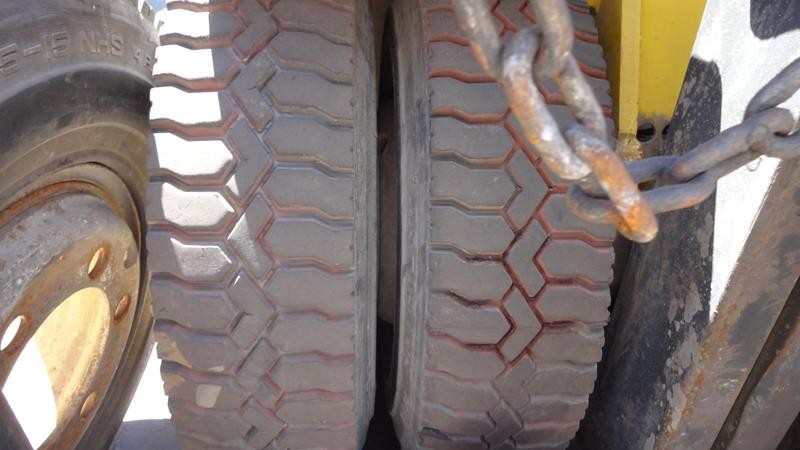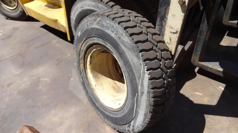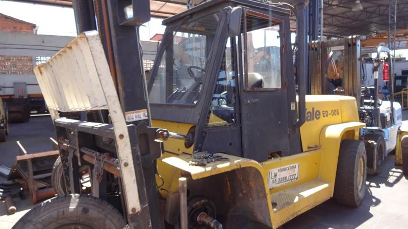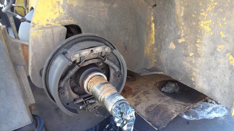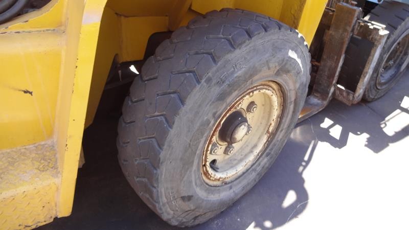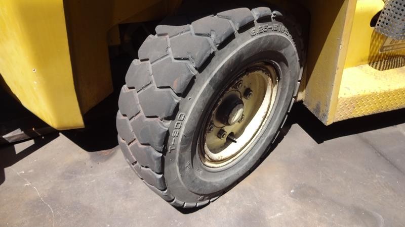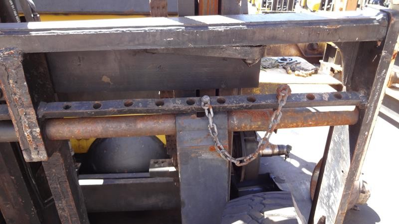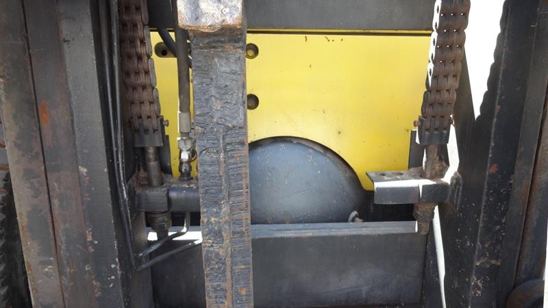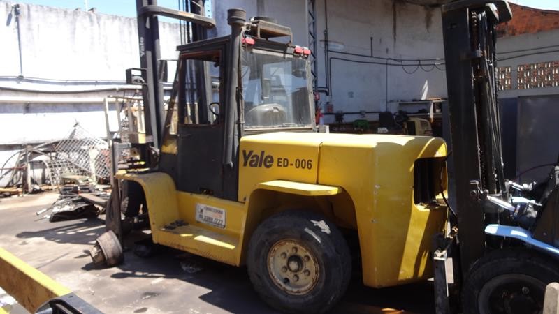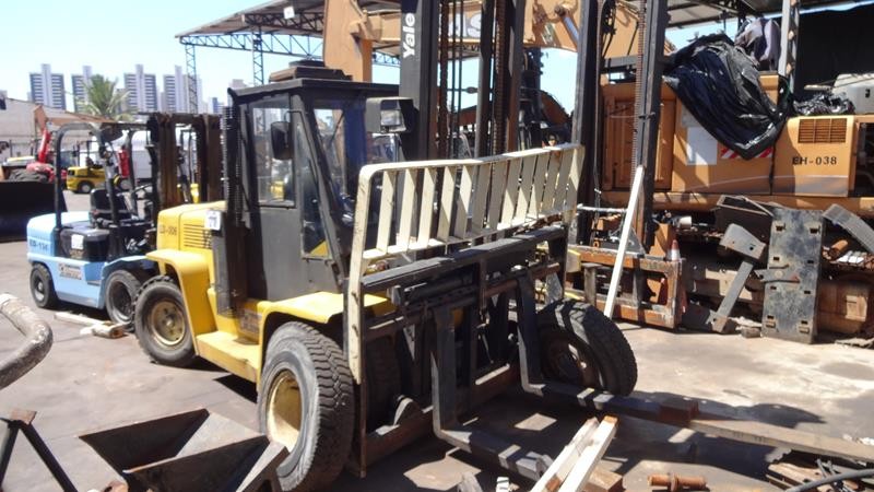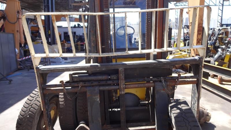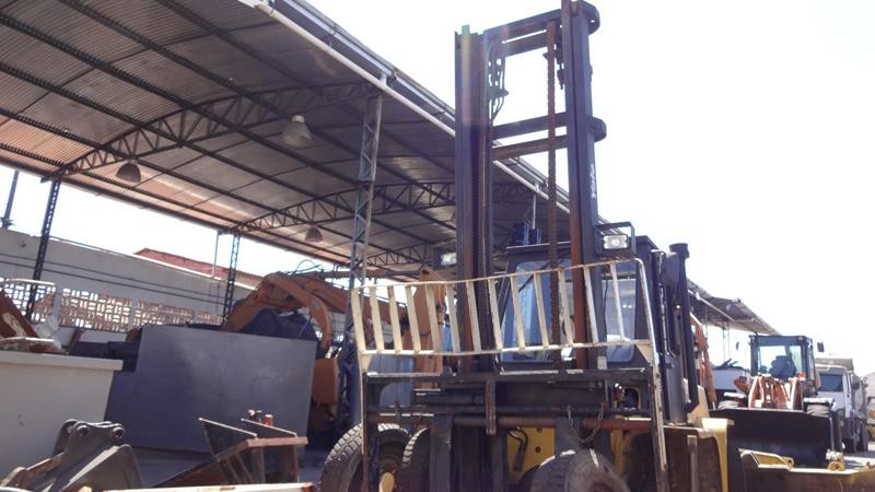 Equipamento operacional fazendo revisão nos freios, equipado com torre simplex com deslocamento lateral e garfo de olhau, motor Perkins e cabine fechada com ar condicionado.