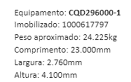 EQUIPAMENTO DISPONIBILIZADO NAS CONDIÇÕES QUE SE ENCONTRA. PARA ESSA OPERAÇÃO SERÁ NECESSÁRIO PLANO DE RIGGING E OPERAÇÃO COM GUINDASTE, ASSIM COMO MOBILIZAÇÃO NO SGC VALE - IMAGEM ILUSTRATIVA - ORIENTAMOS VISITAR O LOTE NA AREA. - LOTE ÚNICO - SERÁ VENDIDO NO ESTADO EM QUE SE ENCONTRA - MECÂNICA SEM TESTE – SEM GARANTIA - PODE HAVER FALTA DE PEÇAS, REMARCAÇÕES/ REGULARIZAÇÕES DE CHASSI/ MOTOR/ CARROCERIA E OUTROS, JUNTO AOS ÓRGÃOS COMPETENTES, SERÃO POR CONTA DO COMPRADOR - RETIRADA/ CARREGAMENTO SERÃO POR CONTA DO COMPRADOR - VERIFIQUE AS CONDIÇÕES DE RETIRADA – VISITE O LOTE, POIS NÃO SERÃO ACEITAS RECLAMAÇÕES POSTERIORES.