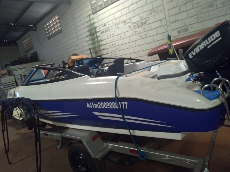 Lancha Motorboat com motor de 50 HP evinrude - Capacidade: 1 tripulante e 6 passageiros.- Ano de fabricação: 2008 - Comprimento: 5 metros - Fibra de vidro - Com rebocador marca real, chassis; 9a9e330irgucm2090. Ano de fabricação: 2016 - LOTE ÚNICO - SERÁ VENDIDO NO ESTADO EM QUE SE ENCONTRA - SEM TESTE - VISITE O LOTE NÃO SERÁ ACEITO RECLAMAÇÕES POSTERIORES