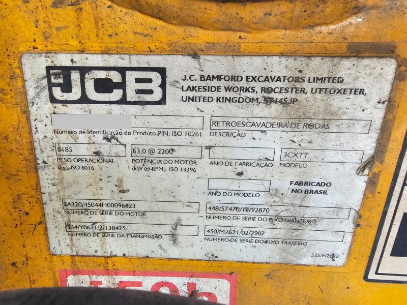 RETROESCAVADEIRA JCB; MODELO 3CX 4X4; ANO 2016; EMPLACADA - FUNCIONANDO - PLACA FINAL 65