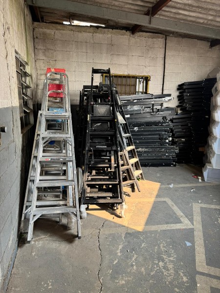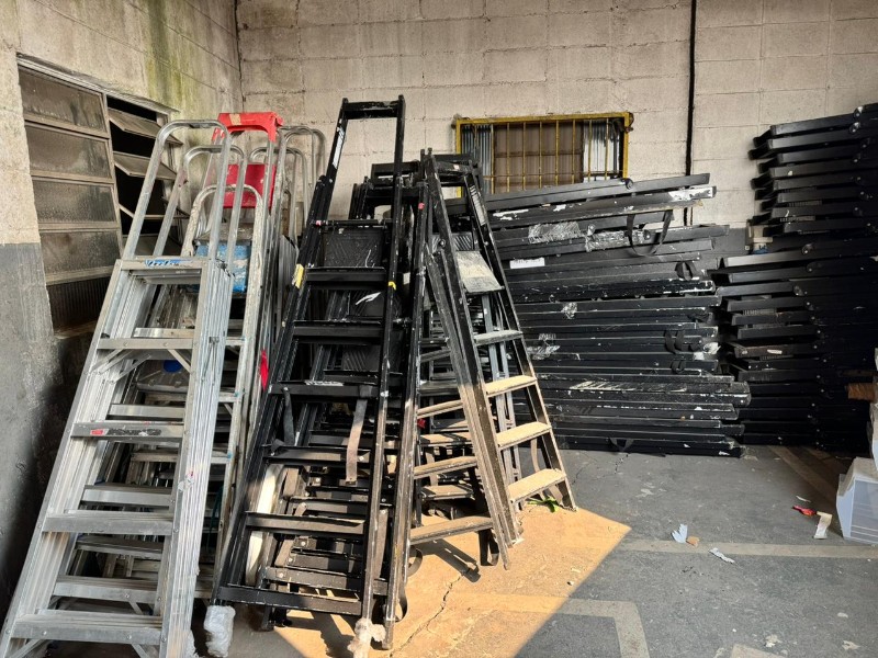 LOTE COM APROX. 60 ESCADAS EM ALUMÍNIO; C/ 5 DEGRAUS PARA 250KG OU C/ 7 DEGRAUS PARA 150KG