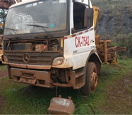 MARI-CK7542-2019 - CAMINHÃO GUINDAUTO - MERCEDES BENZ - ATEGO 1725 - ANO: 2006 - SERIAL / CHASSI: 9BM9580746B467196 - RENAVAM: 925517003 - PLACA: HDF-9688 - SEM PLACAS - TAG/CP: CK7542 - KMS / HRS TRABALHADAS: 12 ANOS - CONDIÇÃO: DESATIVADO - IMOBILIZADO: 1000137516 - 8000013669 - MOTOR: NÃO - TRANSMISSÃO: NÃO - CAÇAMBA(PÁ)/LÂMINA: NÃO - SEM CONDIÇÕES OPERACIONAIS ATUAIS. CAMINHÃO NECESSITA DE AQUISIÇÃO DE TODO O CONJUNTO DE FORÇA, EIXO TRASEIRO COMPLETO, PAINEL COMPLETO, NECESSITA DA AQUISIÇÃO DE NOVO CIRCUITO ELETRICO, ALÉM DE TODOS OS COMPONENTES AVARIADOS POR EXPOSIÇÃO A INTEMPERIE. NÃO TEM MOTOR E TRANSMISSÃO. NÃO TEM COMPONENTES ELETRICOS.REFORMA GERAL NO TREM DE FORÇA (MOTOR, CAIXA DE TRANSFERENCIA, EIXO CARDAN E DIFERENCIAL); PNEUS SEM CONDIÇÕES DE RODAGEM (FALTAM PNEUS E RODAS TRASEIRAS); FALTA O EIXO TRASEIRO; PAINEL OPERACIONAL FALTANDO COMPONENTES, NECESSITA DE AQUISIÇÃO DE NOVO CIRCUITO ELÉTRICO, ALÉM DE TODOS OS COMPONENTES AVARIADOS POR EXPOSIÇÃO A INTEMPERIES. GUINDAUTO APRESENTA VAZAMENTO, TANQUE HIDRAULICO CONTAMINADO, CILINDRO HIDRAULICO APRESENTA VAZAMENTO PELAS HASTEAS, SISTEMA HIDRAULICO COM CONTAMINAÇÃO. SERÁ VENDIDO NO ESTADO QUE SE ENCONTRA. - SERÁ VENDIDO NO ESTADO DE CONSERVAÇÃO EM QUE SE ENCONTRA LOC: MARIANA-MG