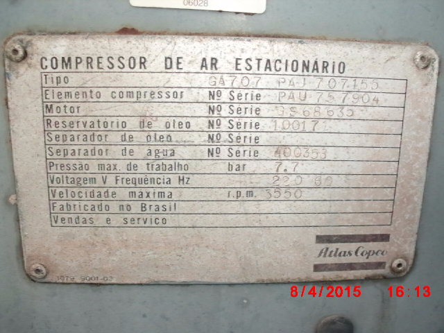 Compressor Atlas Copco Parafuso GA 707 de 100 hp , cod patio 60