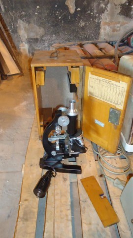 1 MICROSCÓPIO LABORATORIAL E 1CALCULADORA ANTIGA (RELÍQUIAS),