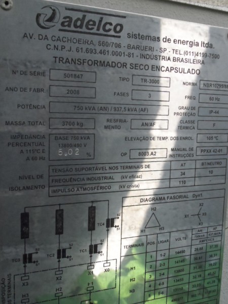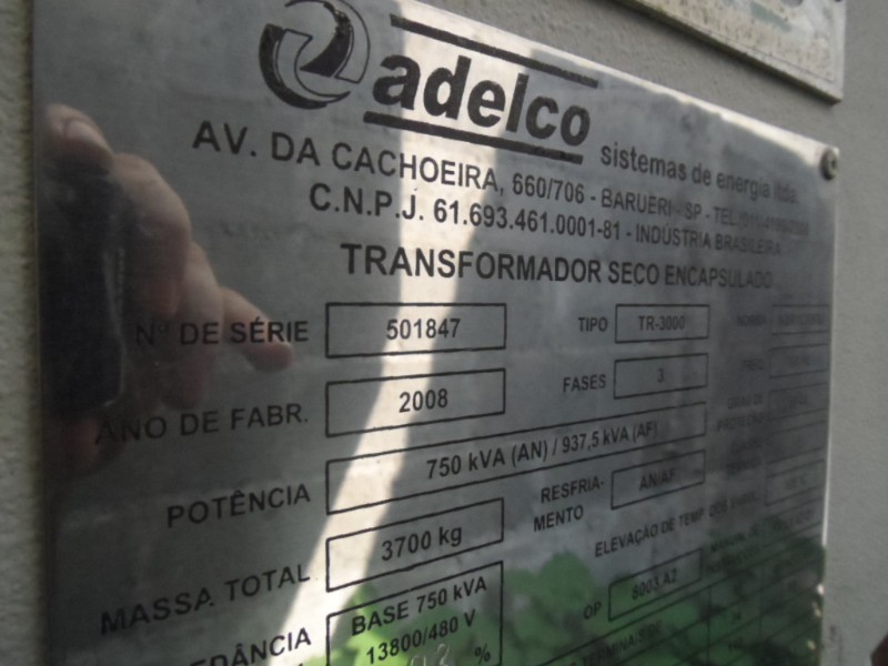 TRANSFORMADOR ADELCO 750 KVA 2008 3.700 KG TR 3.000 Nº SERIE: 5011847