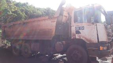 CAMINHÃO SEM PRIMEIRO EMPLACAMENTO; SEM DIREITO A DOCUMENTAÇÃO - SERA VENDIDO NO ESTADO EM QUE SE ENCONTRA- LOC. Corumbá/MS - Cabine com defeitos, ar condicionado ausente, painel parcialmente desmontado com ausência de fusíveis, reles e unidades eletrônicas, ausência de fechadura, maçaneta, forro da porta parcialmente desmontada. Estrutrua externa com defeito,com ausência de grade frontal inferior. Sistema elétrico com bateria sem carga , ausência de alguns chicotes elétricos, ausência do motor de partida. Sistema de iluminação com defeito e com farol solto. Sistema hidráulico com defeito, não esta basculando a cabine. Sistema de refrigeração ausente (falta de radiador e mangueiras). Trem de força ausente. Pneus e rodas: ausente 2, e 5º, LE/LD, sem pneus e rodas internas 3º, 4º eixos LD. Implemento com caçamba danificada, sistema de elevação inoperante.