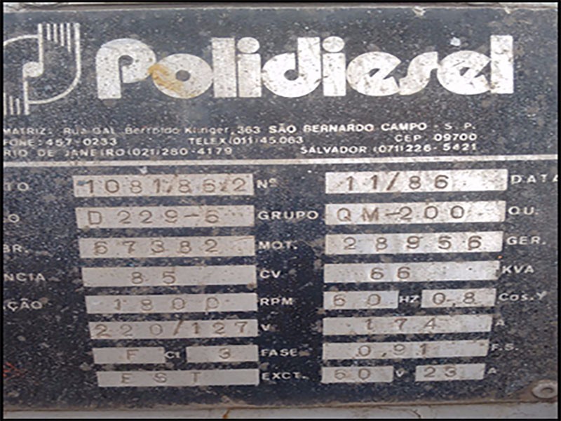 IMOBILIZADO SAP: 8000001654 - SERIAL / CHASSI: NA - RENAVAM: NA - PLACA: NA - TAG/CP: NA - KMS / HRS TRABALHADAS: NA - MOTOR: SIM - TRANSMISSÃO: NÃO - CAÇAMBA(PÁ)/LÂMINA: NÃO - TRANSPORTE E CARREGAMENTO FICA SOB RESPONSABILIDADE DO COMPRADOR: PESO ESTIMADO: 910 KG - NECESSÁRIO MANUTENÇÃO PARA FUNCIONAMENTO DO EQUIPAMENTO. - SERÁ VENDIDO NO ESTADO DE CONSERVAÇÃO EM QUE SE ENCONTRA - ESTE EQUIPAMENTO, DEVIDO SUAS DIMENSÕES, EXIGIRÁ DESMONTAGEM PARCIAL/TOTAL PARA PROPORCIONAR O SEU TRANSPORTE/RETIRADA. PARA TRABALHOS EM ALTURA SUPERIOR A 1,80 MTS FAZ-SE NECESSÁRIO A UTILIZAÇÃO DE ESCADA PLATAFORMA E/OU PLATAFORMA ELEVATÓRIA. PARA IÇAMENTO DAS CARGAS, DEVERÁ SER UTILIZADO EQUIPAMENTO DE GUINDAR COM CAPACIDADE COMPATÍVEL COM O PESO DA PEÇA. PARA PEÇAS COM PESO SUPERIOR A 10 T SERÁ NECESSÁRIO PLANO DE RIGG. PARA MOVIMENTAÇÃO DE PEÇAS DEVERÁ SER UTILIZADO CAMINHÃO MUNCK OU EMPILHADEIRA COM CAPACIDADE COMPATÍVEL COM O PESO DESTES ITENS. DEVERÁ SER OBSERVADO O CUMPRIMENTO A LEGISLAÇÃO APLICÁVEL E ATENDIMENTO AOS REQUISITOS LEGAIS. - CONDIÇÃO: DESATIVADO - LOC.: VITÓRIA / ES