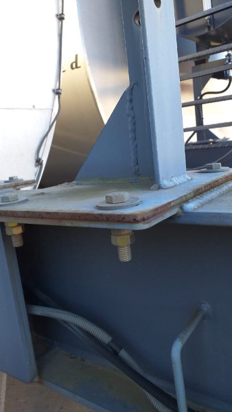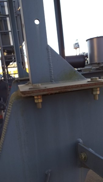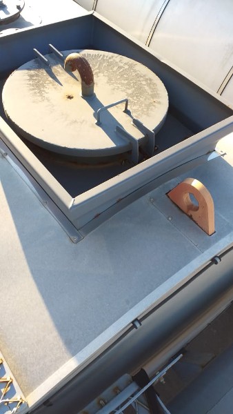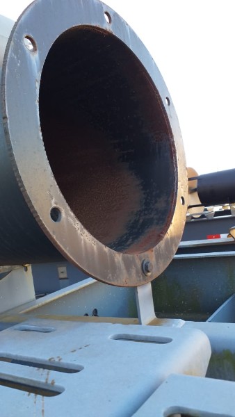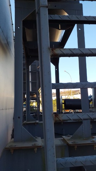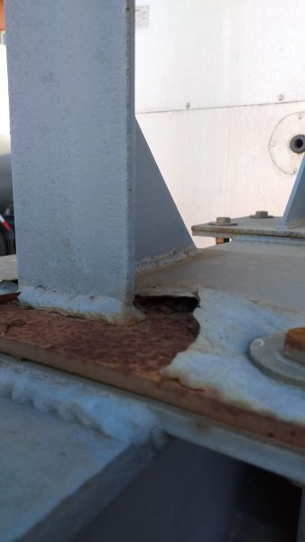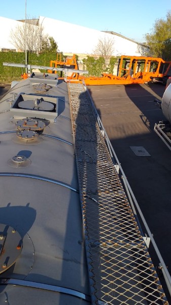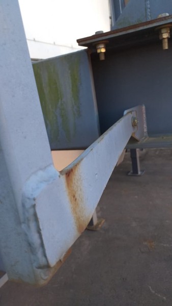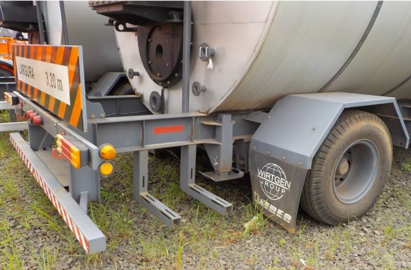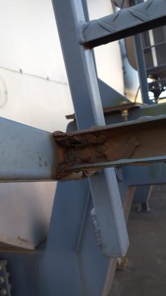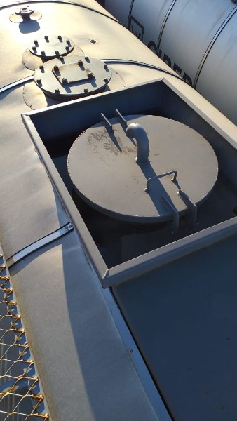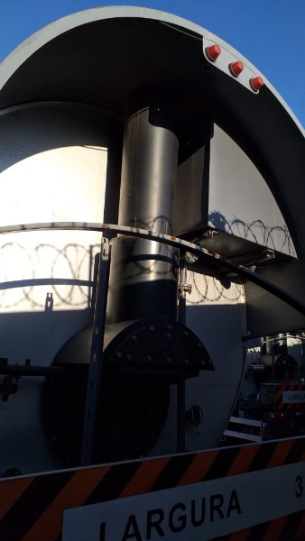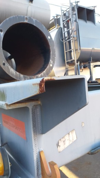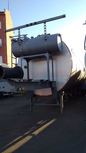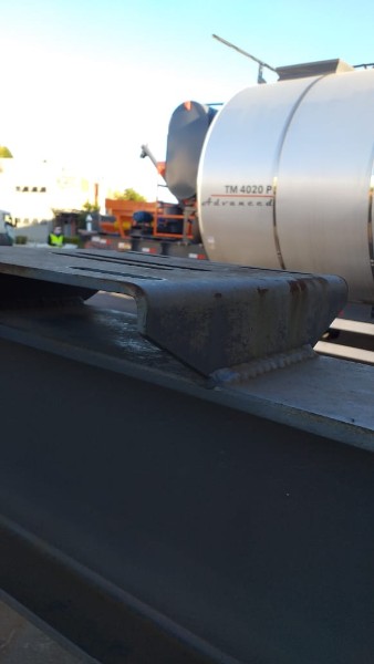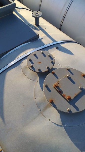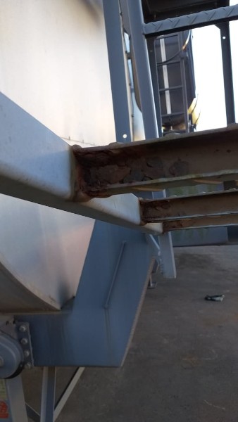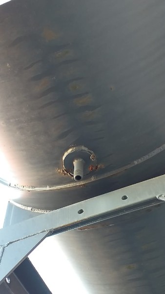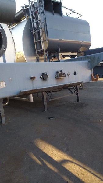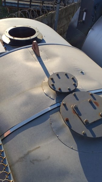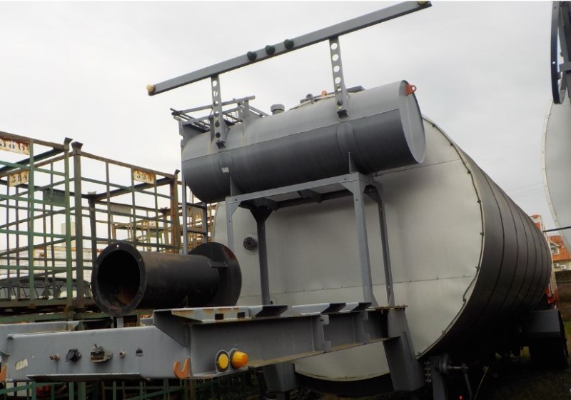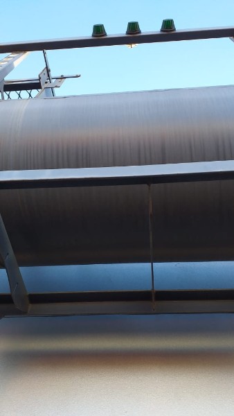 "Tanque de aquecimento armazenamento de Asfalto ou combustível. Acessório para usina de asfalto. Com aquecedor de fluído térmico incorporado. Com serpentinas de circulação de óleo térmico, construido sob-chassis rodoviário.Capacidade total de 50.000 litros divididos em 2 compartimentos. de 20.000 e 30.000 l. Alguns elementos faltantes: Proteção anti-ciclista, falta lanternas traseira. Não possui aquecedor de fluido térmico, somente conjunto soldado, Falta queimador, Painel de comando e tubulação Tanques com sinals de oxidação devido a exposição ao tempo. NÃO PODE TRANSITAR EM VIA PÚBLICA SEM OS ITENS DE SEGURANÇA." Tanque com sinais de oxidação e exposição ao tempo. Aquecimento de fluído térmico incompleto, faltam queimador, painel de comando e tubulação.