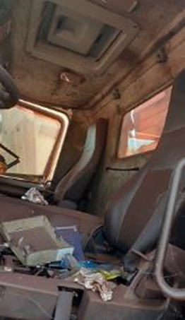 CABINE COM DEFEITO E PAINEL PARCIALMENTE DESMONTADO FALTANDO FUSÍVEIS, RELES E UNIDADES ELETRONICAS . ESTRUTRUA EXTERNA COM DEFEITO. SISTEMA ELÉTRICO COM DEFEITO, COM AUSÊCIA DE BATERIA E INSTRUMENTOS. SISTEMA DE ILUMINAÇÃO COM DEFEITO, COM AUSÊNCIA DE FAROLETES TRASEIROS. SISTEMA HIDRÁULICO COM DEFEITO. SISTEMA DE REFRIGERAÇÃO COM DEFEITO. TREM DE FORÇA COM DEFEITO . PNEUS COM DEFEITO, COM AUSENCIA DE PNEUS DO 2º EIXO. RODAS COM DEFEITO. IMPLEMENTOS COM DEFEITO. ESTADO DO CHASSI MUITO DESGASTADO. AUSÊNCIA DO 2º EIXO. CARREGAMENTO E RETIRADA POR CONTA DO COMPRADOR - SERÁ VENDIDO NO ESTADO DE CONSERVAÇÃO EM QUE SE ENCONTRA LOC: CORUMBÁ/MS
