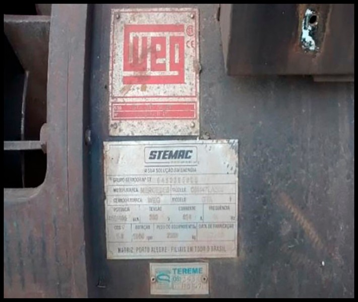 CONDIÇÃO: DESATIVADO - MARCA / MODELO: MERCEDES -WEG / GTA - ANO: 2005 - IMOBILIZADO SAP: 8000005569 - SERIAL / CHASSI: NA - RENAVAM: NA - PLACA: NA - TAG/CP: NA - KMS / HRS TRABALHADAS: NA - MOTOR: NÃO - TRANSMISSÃO: NÃO - CAÇAMBA(PÁ)/LÂMINA: NÃO - TRANSPORTE E CARREGAMENTO FICA SOB RESPONSABILIDADE DO COMPRADOR: GRUPO GERADOR WEG, MOTOR MERCEDES, MODELO GTA PESO ESTIMADO: 2.350 KG - NECESSÁRIO MANUTENÇÃO PARA FUNCIONAMENTO DO EQUIPAMENTO. - SERÁ VENDIDO NO ESTADO DE CONSERVAÇÃO EM QUE SE ENCONTRA-LOC. JOÃO NEIVASERÁ VENDIDO NO ESTADO DE CONSERVAÇÃO EM QUE SE ENCONTRA, RETIRADA/CARREGAMENTO POR CONTA DO COMPRADOR - VISITE O LOTE NÃO SERÃO ACEITAS RECLAMAÇÕES POSTERIORES. LOC LOC.: JOÃO NEIVA/ES